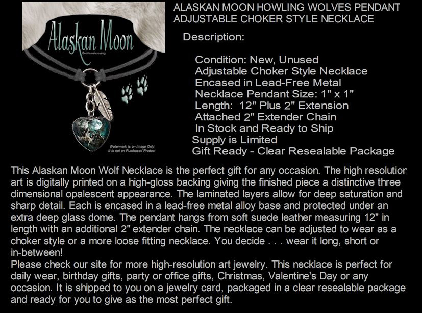 The Alaskan Moon Dog Wolf Necklace is an exquisite gift for any occasion. The high-resolution artwork is digitally printed on a high gloss backing, giving the finished piece a distinctive three-dimensional opalescent appearance. The laminated layer allows for deep saturation and extra sharp detail. Encased in a lead-free silver metal base and protected under an extra deep glass dome, the pendant hangs from a double-layer soft suede leather cord, 12″ in length with an additional 2″ extender chain. The necklace can be adjusted to wear as a choker or a more loose-fitting necklace.