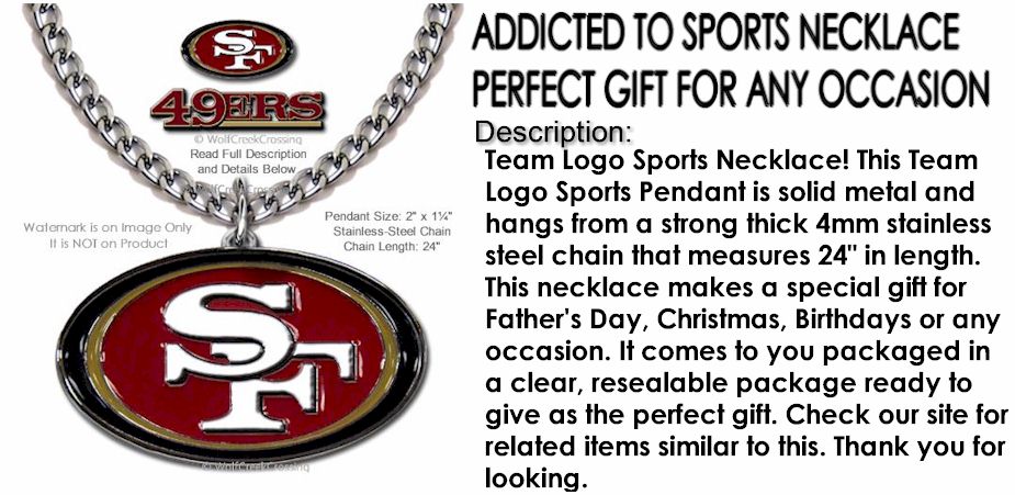 Tags: 24 inch chain, Cali, Californai, jewelry, Large 49ers Necklace, Large Pendant, necklace, nfl, Solid Metal Pendant, Sports Fan, Sports Gift, stainless steel, team logo
