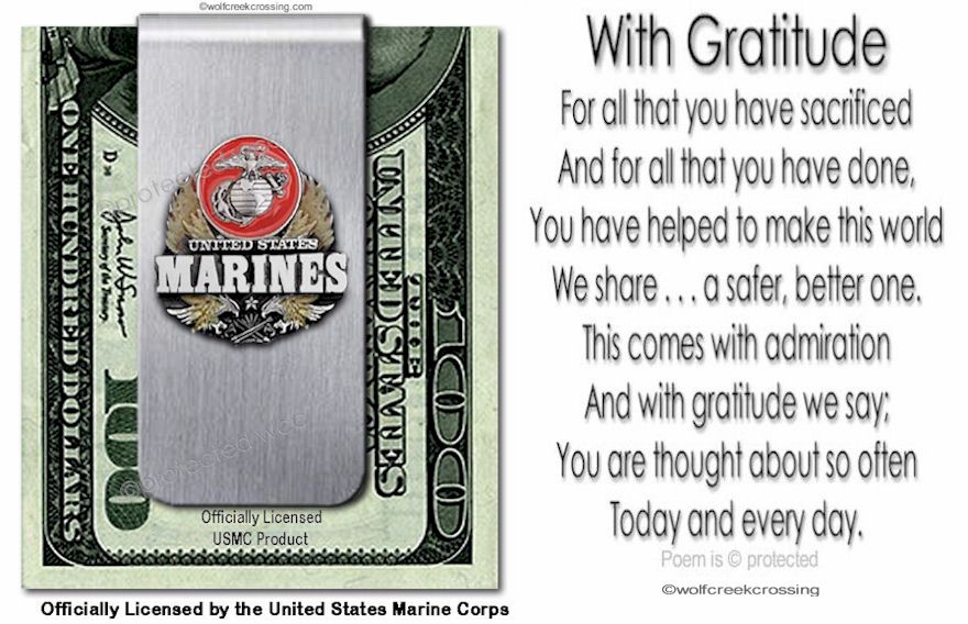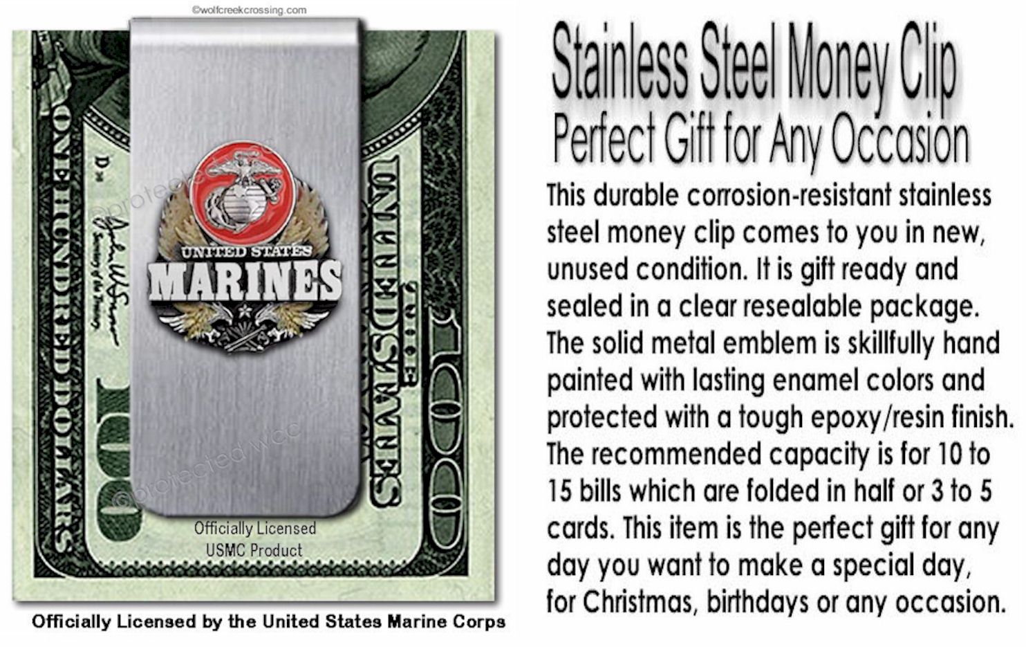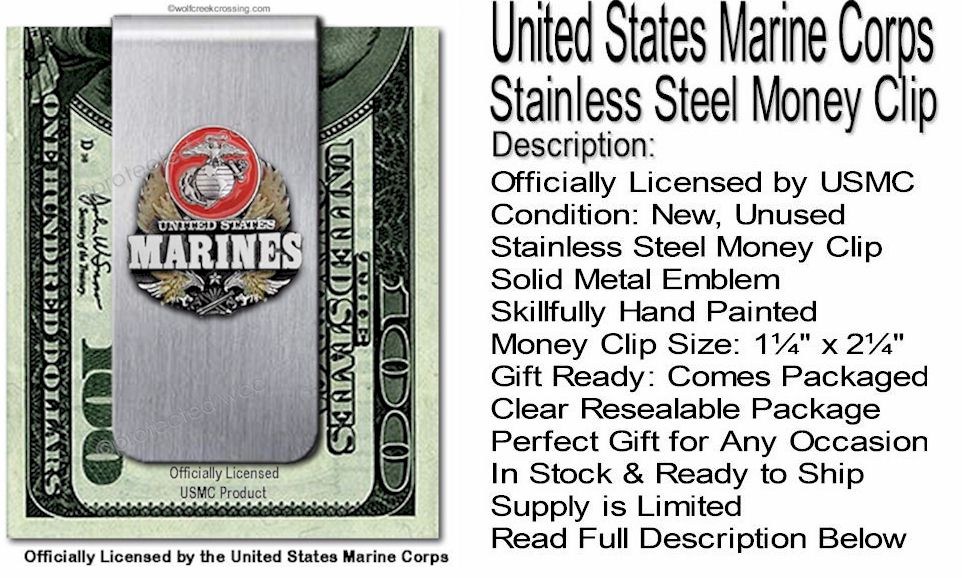 This item is officially licensed by the United States Marine Corps. It is a durable corrosion resistant stainless steel money clip. The money clip is sent to you in new, unused condition. The emblem is solid metal, hand-painted and is cast to show exceptional depth and detail. This money clip is gift ready, carded and sealed in a clear resealable package. The recommended capacity is for 10 to 15 bills which are folded in half or 3 to 5 cards. This item is the perfect gift for any day you want to make a special day, for Christmas, Father’s or Mother’s Day, birthdays or any occasion. Please check our store for related items. We offer many unique items that cannot be found anywhere else on the Internet. Thank you for looking.
